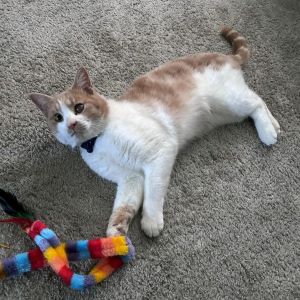 J.B.F. - This adorable manx kitten was found in the middle of the road and brought to us. He needed 2 butt surgeries to be a normal and after having the best vet care he has recovered. J.B.F. is in the most fun-loving home with the best family ever!